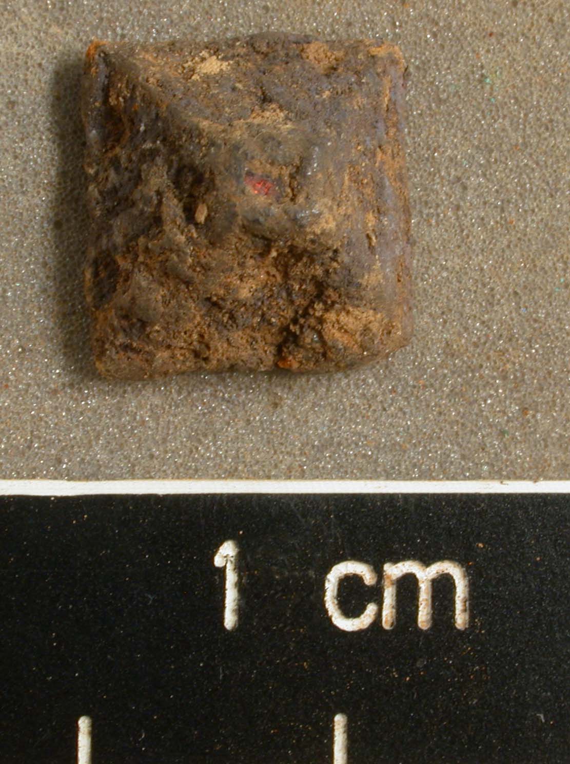 These decorative pyramidal decorations were found associated with the sword.  They were located close to the mouth of the sword scabbard, and are perhaps part of some kind of strap due to the appearance from the back.