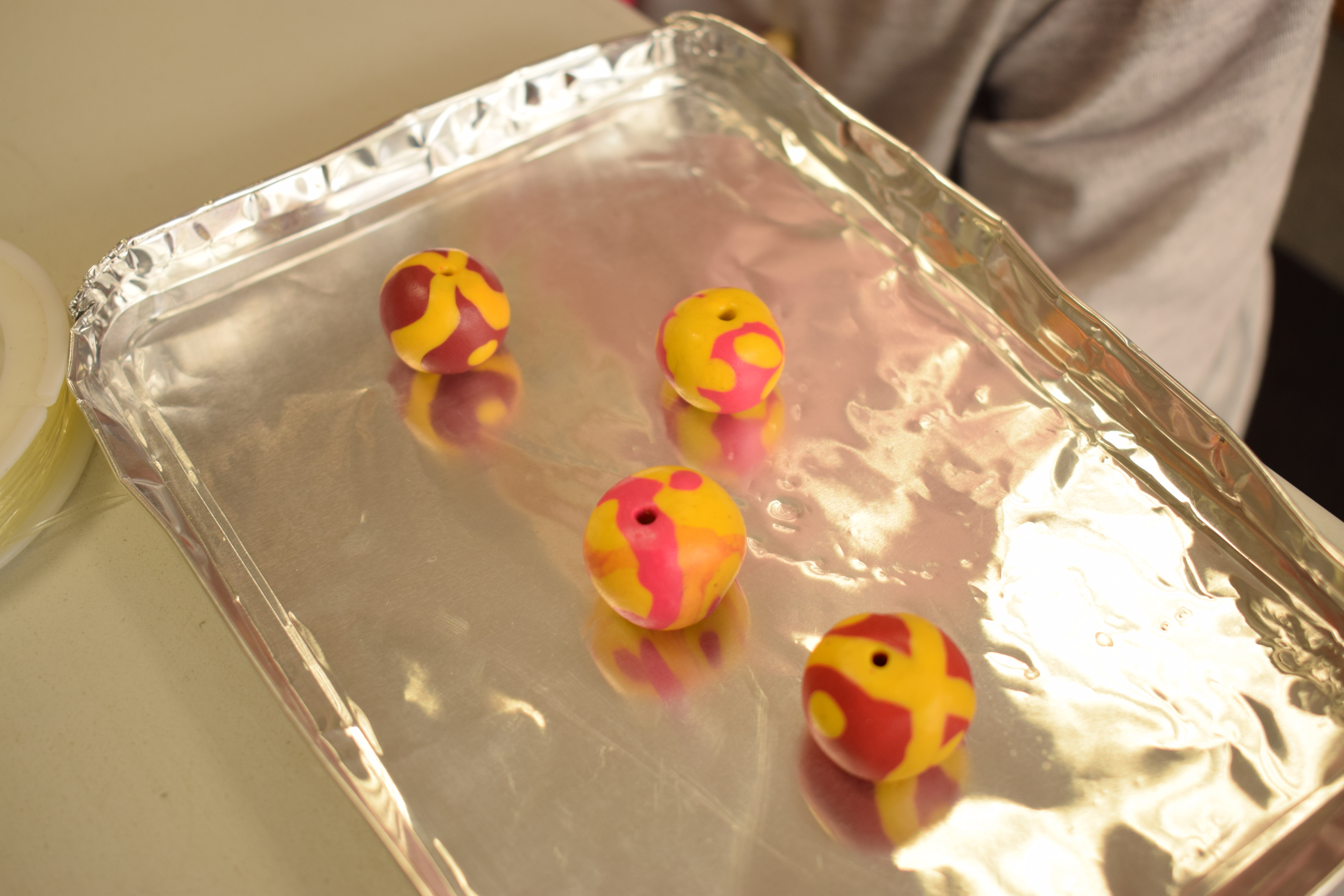 We’ve been making clay beads inspired by the colourful Anglo-Saxon beads found along the HS1 route. Made from glass, amber, and amethyst, the original beads are in great condition as their colours don’t fade. You can see some of the best examples even when we’re closed in the window display.
