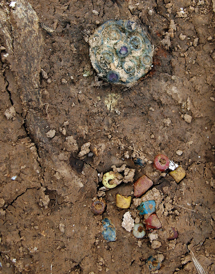 But the dead were being buried at this place long before the 6th century AD. The ring ditch was probably associated with a now vanished Bronze Age round barrow, part of several situated along the low ridge that bisects the site from north-east to south-west. The mound and central burial have not survived, although the ditch fill produced an interesting assemblage of worked flint and prehistoric pottery (as did many of the Anglo-Saxon grave fills), indicating activity on the site during the Mesolithic and Neolithic periods. A major surprise was the discovery of four Beaker vessels in a cluster of features away from the barrow. These seem to represent accessory vessels from three inhumations, along with one cremation. Other prehistoric features in this part of the site include post holes and what appears to be a segmented ditch; the latter partially encloses the area centred on the Beaker burials and has produced early prehistoric, possibly Neolithic, pottery.
