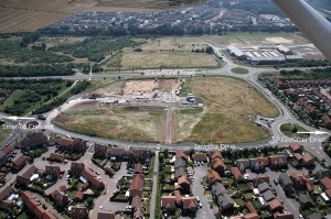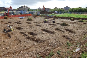 Construction of a mixed retail and residential development, on an area known as ‘The Meads’, near Sittingbourne, commenced in May 2008. The site, which straddles the boundary between Sittingbourne/Milton Regis and Bobbing, had been subject to Brickearth extraction in the past, so surviving archaeology was not expected, despite an aerial photograph of 1982 which appeared to show the crop-marks of large ring ditches on the site. Consequently, a condition for a watching brief was placed on the site, which was carried out by Andy Linklater of Canterbury Archaeological Trust.